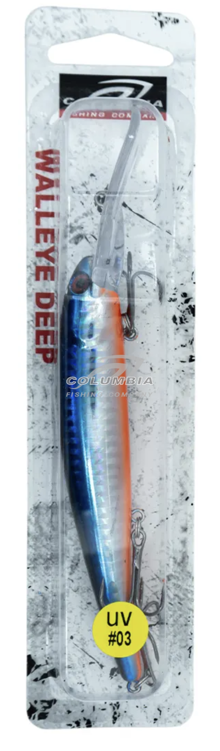 Воблер Columbia Walleye Deep - данный воблер имеет длину 120мм и вес 17,5гр, заглубление 2,4 - 3,6м. Этот малек отлично подойдет для ловли судака методом троллинга, но так-же может использоватся в рыбалке в заброс на щуку. Для улучшения полетных характеристик и увеличения дальности заброса приманка имеет специальный груз-шарик, перемещающийся в хвостовую часть, который так-же создает шумовой эффект. Лопасть снабжена монтажной петелькой. В серии представлены вариации с различными окрасками.